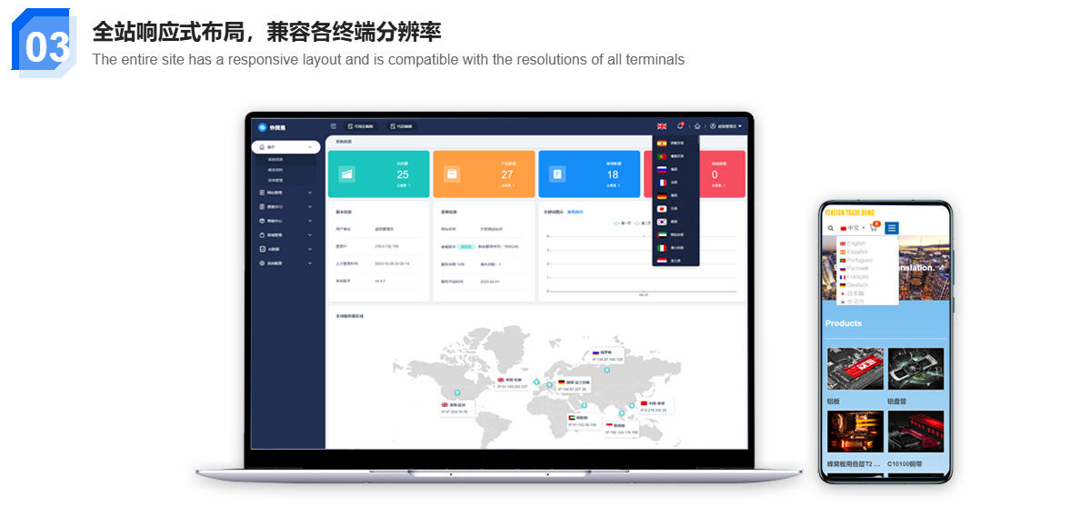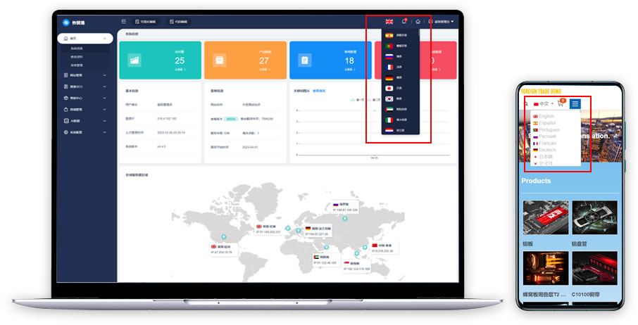 多語站點(diǎn)PC、移動(dòng)雙端同一管理后臺(tái),并支持接入三方CRM系統(tǒng)的線索